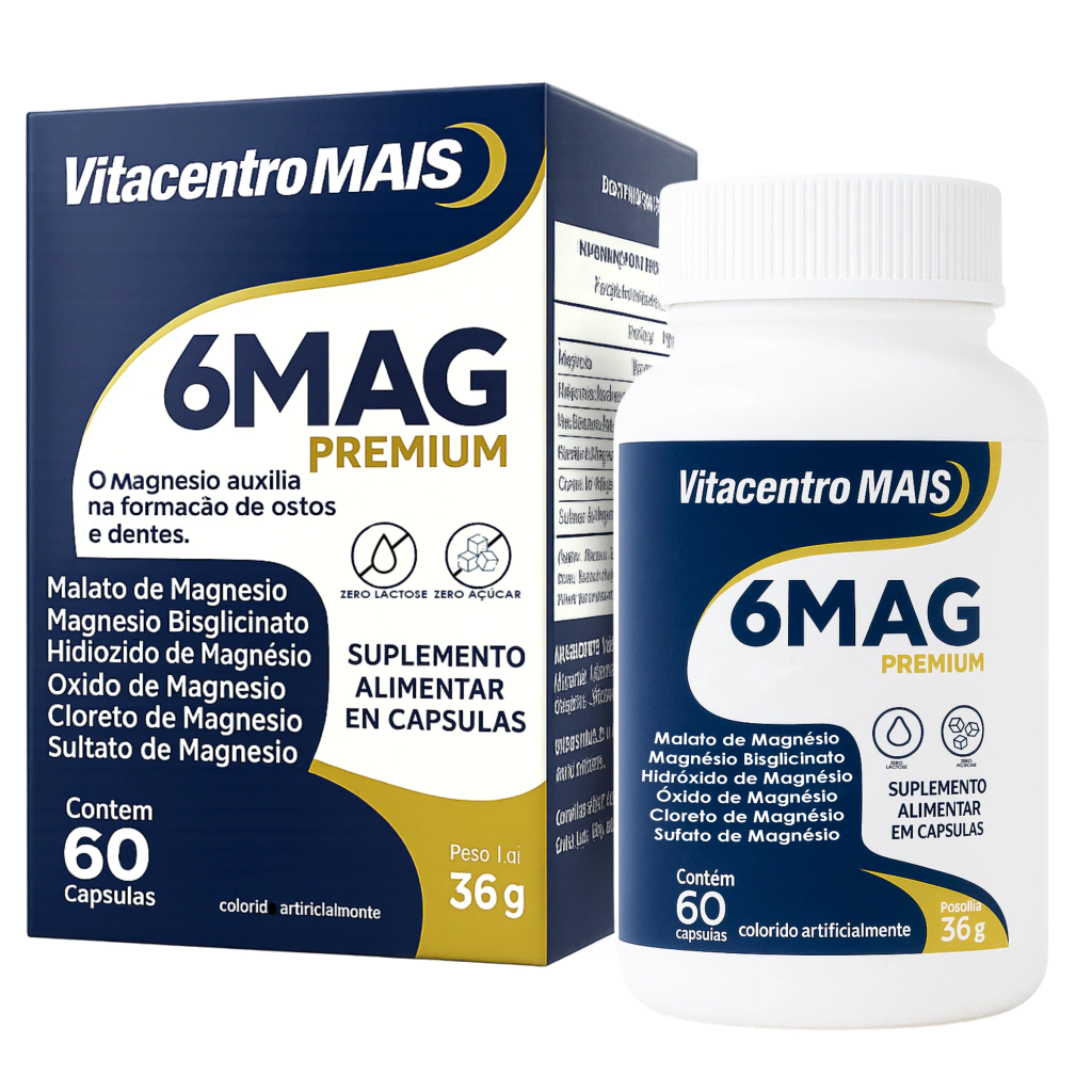 O 6 MAG Premium – 60 cápsulas combina 6 tipos de magnésio de alta absorção para oferecer suporte completo ao corpo e à mente, em uma fórmula prática para uso diário.