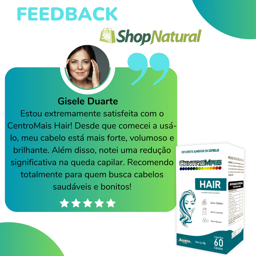 CentroMais Hair é ideal para quem busca mais saúde e bem-estar no dia a dia. Formulado com ingredientes selecionados, contribui para o equilíbrio do organismo. Consulte sempre um profissional de saúde antes do uso.