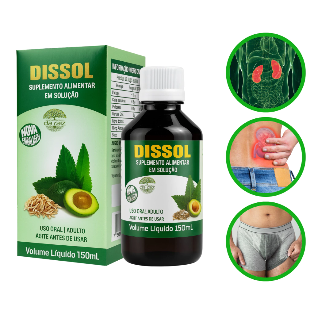 O Dissol – 150 ml é um suplemento líquido natural, formulado com ativos que auxiliam na dissolução de cálculos renais, minimizando desconfortos como cólicas e contribuindo para a saúde do trato urinário.