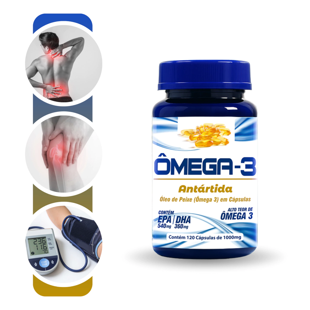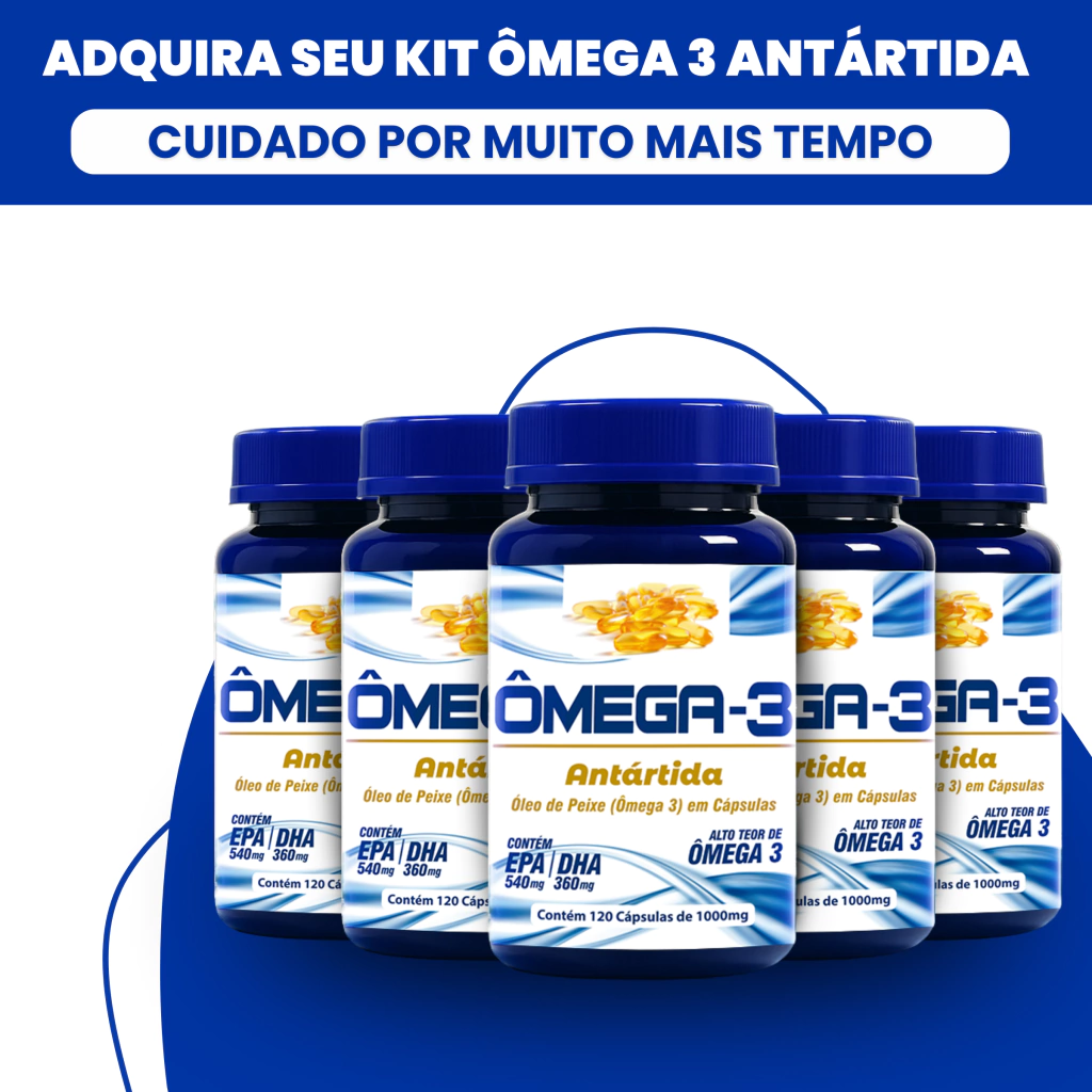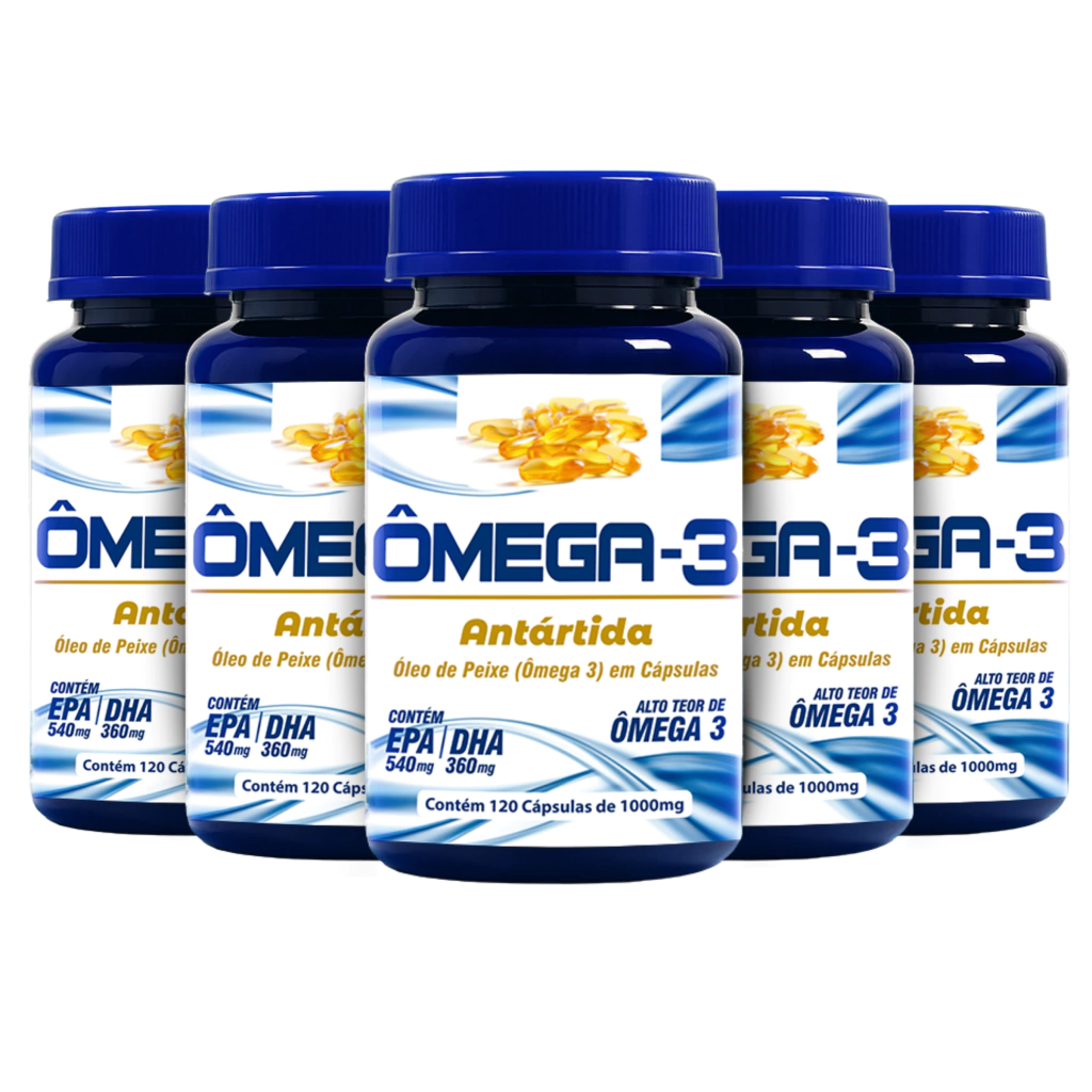 Kit 5x Ômega 3 Antártida 120 Cápsulas (600 Cápsulas) é um suplemento de óleo de peixe de alta pureza, obtido de águas geladas e profundas da Antártida. Rico em EPA e DHA, auxilia na manutenção da saúde cardiovascular, cerebral e articular com máxima absorção e qualidade.